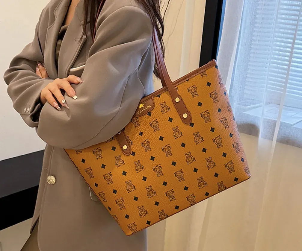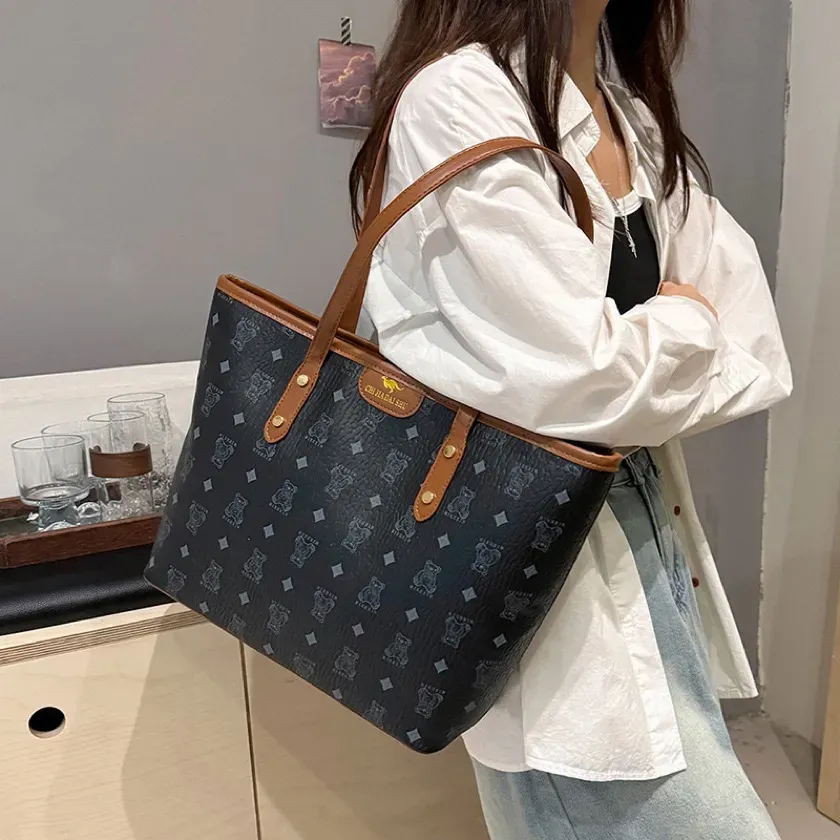 Una mujer elegante con una camisa blanca lleva consigo un bolso de mano negro y marrón, perfecto para complementar cualquier atuendo. Este bolso espacioso y moderno es ideal para llevar tus pertenencias con estilo y comodidad en tu día a día en Perú.