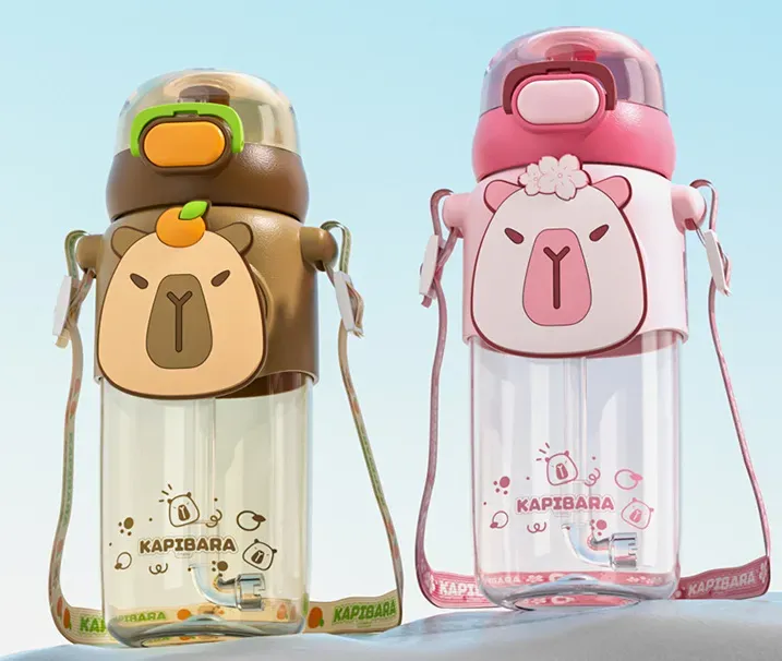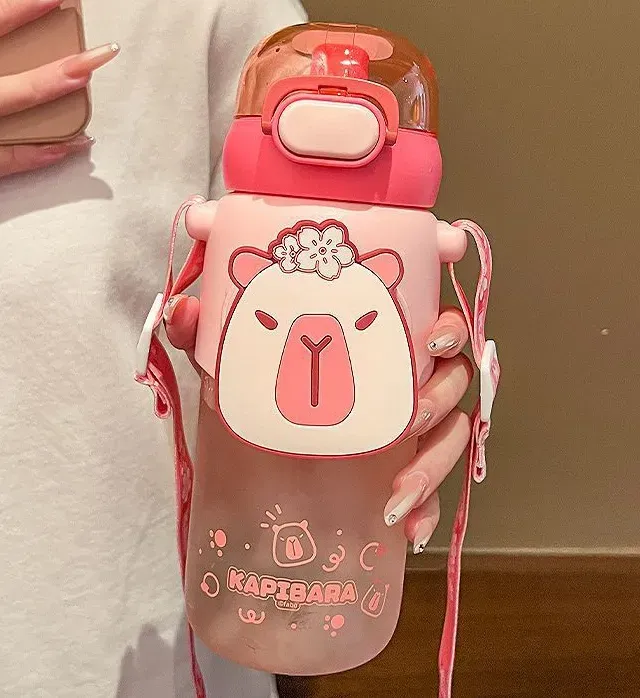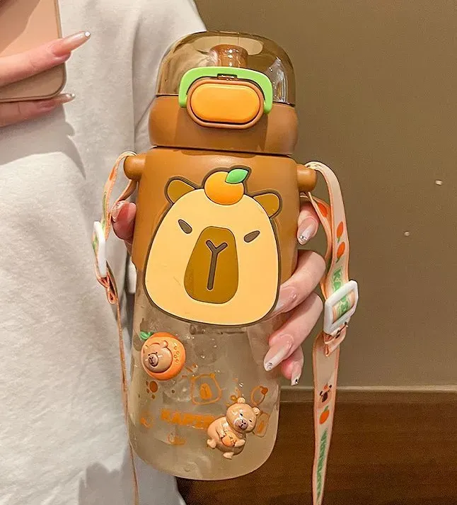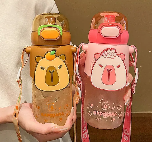 Dos botellas de agua con la palabra 'kapibara' impresa en ellas. Perfectas para mantenerte hidratado mientras muestras tu amor por estos adorables animales. Ideales para llevar al trabajo, la escuela o hacer ejercicio. ¡Hazte con estas botellas únicas y destaca entre la multitud!